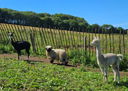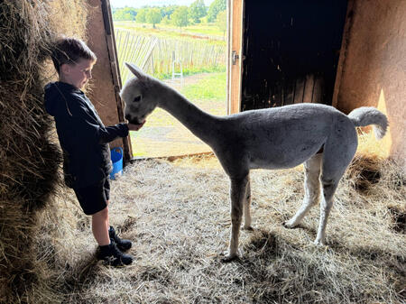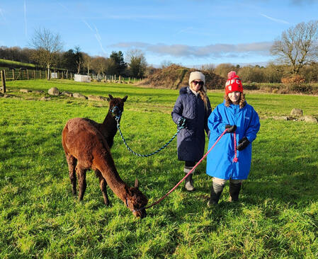 Alpaca trecking involves a 1km long walk around our farm, which starts by getting used to walking them round a field before entering our woodland trail then ending with one on one hand feeding
